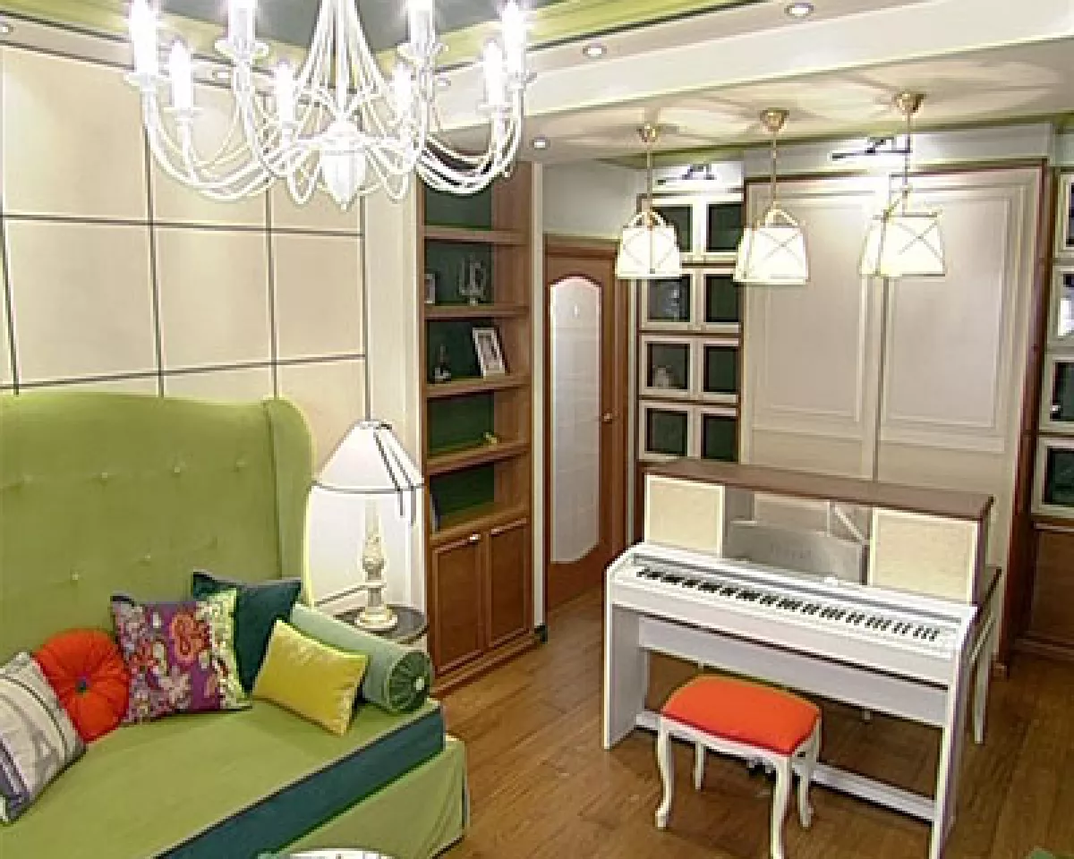 Задачей программы было переделать самую большую комнату квартиры под девичью, то есть вместить в комнату все, что нужно ребенку – кровать, рабочий стол, фортепьяно. И, в принципе, в комнате подобного размера это можно сделать разными способами.
