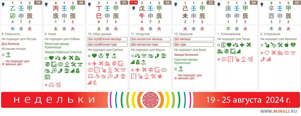 24 августа, суббота. Пара металлических дней впереди. Если Металл вам не полезен, лучше не планировать на эти дни что-то важное. В день 庚申 ша находится в центральном дворце, поэтому ремонт строго не рекомендован. Зато можно общаться, обсуждать что-то (не принимая окончательное решение), ходить на свидания, искать медицинскую помощь, планировать. Тиграм, особенно с полезным Деревом, сегодня стоит посидеть дома.