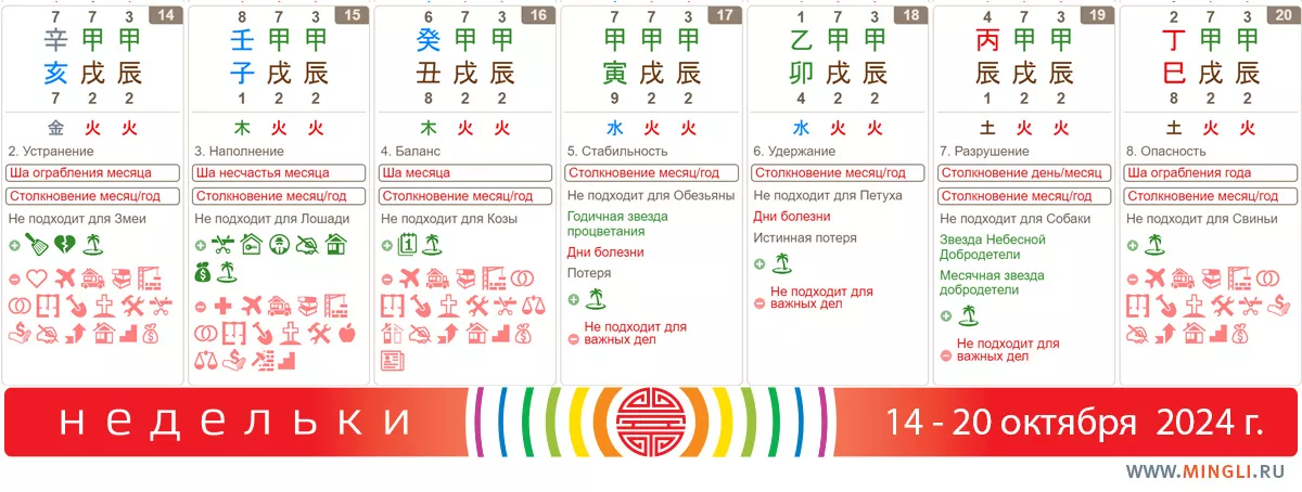 19 октября, суббота. Сегодня помимо столкновения месяца и года наблюдается еще и столкновение с днем. Не устраивайте свадьбу, не начинайте бизнес и проекты, не переезжайте в новый дом и не перемещайтесь. Это приведет к потере денег и сплетням. Бережем своих знакомых с Драконами и Собаками, если же в вашем Бацзы есть такие ребята – лучше провести день, занимаясь незначительными делами или отдыхая.