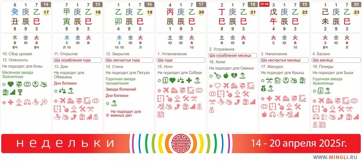 14 апреля, понедельник. Единственный день без ша на неделе, а, значит, если вы планировали начать ремонт или земляные работы, то сделать это можно только в понедельник. Но лучше всего – подождать до начала следующей недели. День подходит для сбора информации, начала учебы, свиданий и прочих прекрасных, но не самых важных вещей. Устройте дома или в офисе переучет и лучше занимайтесь делами средней важности.