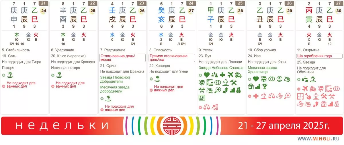 25 апреля, пятница. Отличный день, хотя и не супер сильный! Подходит для большинства позитивных дел, особенно если Дерево вам полезно и вы не Лошадь. Если полезна Вода, используйте час Обезьяны для лучшего результата.