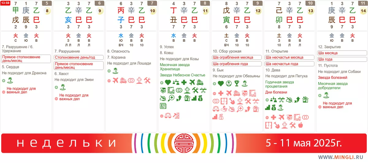 5 мая, понедельник. Смена сезона, начало месяца. Первая половина дня – столкновение; а до скольки именно оно будет, вам нужно проверить в календаре для своего города. Собакам и Драконам (а также тем, у кого эти «звери» стоят в карте Базцы) стоит провести утро спокойнее, не вовлекаясь в конфликты или травмоопасные истории. Затем наступит месяц Змеи и столкновение перестанет действовать. Но и в принципе, первый день месяца не выбирают для чего-то значительного. В этот день не устраивайте свадьбу, переезд в новый дом, не начинайте новые проекты и бизнес. Нарушение правила приводит к тому, что хозяин дома может потерять деньги. Иньским Деревьям лучше проявить бдительность – можно потерять деньги, переплатить, отдать идеи конкурентам.