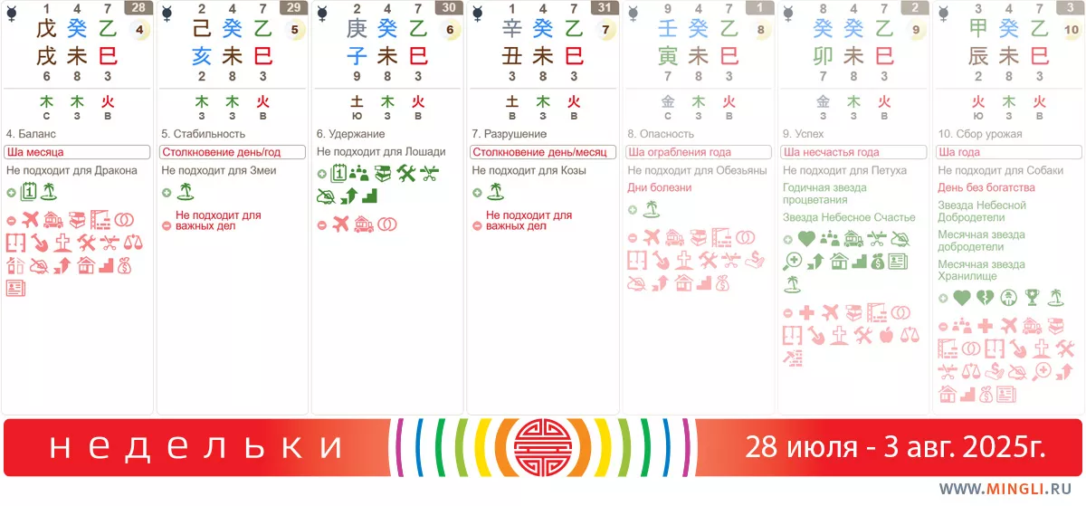 29 июля, вторник. Первое столкновение из двух на этой неделе. Сегодня осторожнее нужно быть Свиньям и Змеям, в первую очередь если столкновение (Свин и Змей) уже есть в карте бацзы. Занимаемся обыденными делами, не вовлекаемся в конфликты, бережемся травм. Очень вероятны расстройства желудочно-кишечного характера.