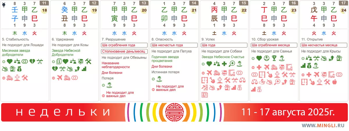 13 августа, среда. Если бы проводился конкурс самого плохого дня недели, то эта среда выиграла бы с большим отрывом! День 甲寅 – это один из дней Четырех Потерь, а также он поврежден Столкновением, Огненным Наказанием и Ша Ограбления плюс это День болезни в придачу. Какие из этого можно сделать выводы? Во-первых, в дальнюю дорогу лучше не отправляться, а за рулем и во время прочих активностей стоит быть предельно внимательными: часы Тигра, Змеи и Обезьяны в этом плане надо выделить отдельно. День травмоопасен. Во-вторых, сегодня лучше не посещать массовые мероприятия, особенно в закрытых помещениях. В-третьих, не лучшая идея – обсуждать супер важные для вас вопросы, если это может привести к конфликту. Конечно, сильнее всего день действует на тех, у кого в карте бацзы уже есть полное или частичное Наказание Неблагодарности (Тигр, Змея, Обезьяна), столкновение (Тигр и Обезьяна). В-четвертых, важные начинания планировать на эту среду не нужно – хорошего результата не будет. В первую очередь, если они касаются подписания документов или денежных вопросов.