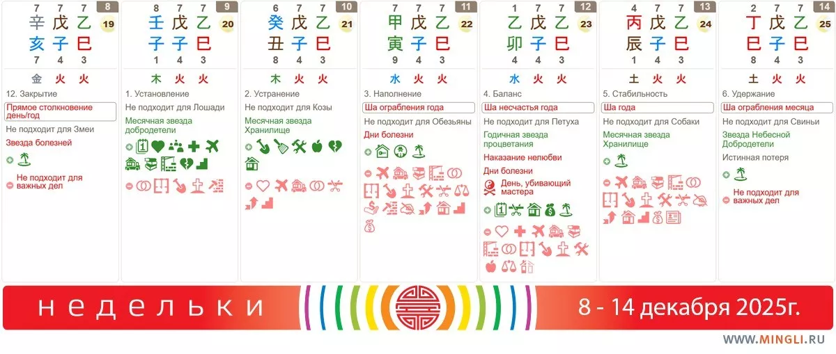 8 декабря, понедельник. Начинаем недельку со столкновения. Многострадальные Свиньи и Змеи (которые, наверняка, уже ждут окончания года) нуждаются в поддержке и одобрении. Ну или просто не трогайте их, если они нервничают. Всем, а вышеперечисленным особенно, стоит быть осторожнее за рулем, во время занятий спортом, да и в словесных перепалках. Сегодняшний день не годится для посещения заболевших друзей или медицинских центров (тем более, что начинать лечение в день столкновения - не лучшая идея).