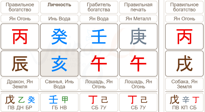 Был у меня в практике такой пример: мужчина родился в день иньской Воды, в месяц Лошади. Стихия Богатства укоренена и проявлена в небесном стволе часа – Янский Огонь 丙. Две Лошади в карте дают самонаказание.