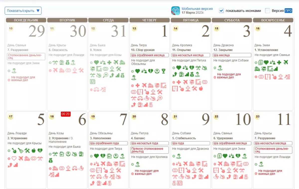 Поищите дни, где больше зеленых иконок. Наведя мышкой на каждую из них, вы сможете прочитать, что она означает. Например, самолетик – это путешествие, 2 кольца – свадьба. То, что иконка зеленая, означает, что данное дело благоприятно начинать в этот день. Можно также настроить вид календаря, когда вместо иконок вы будете видеть перечисление действий. Для этого просто отключите справа сверху галочку «показывать иконками».