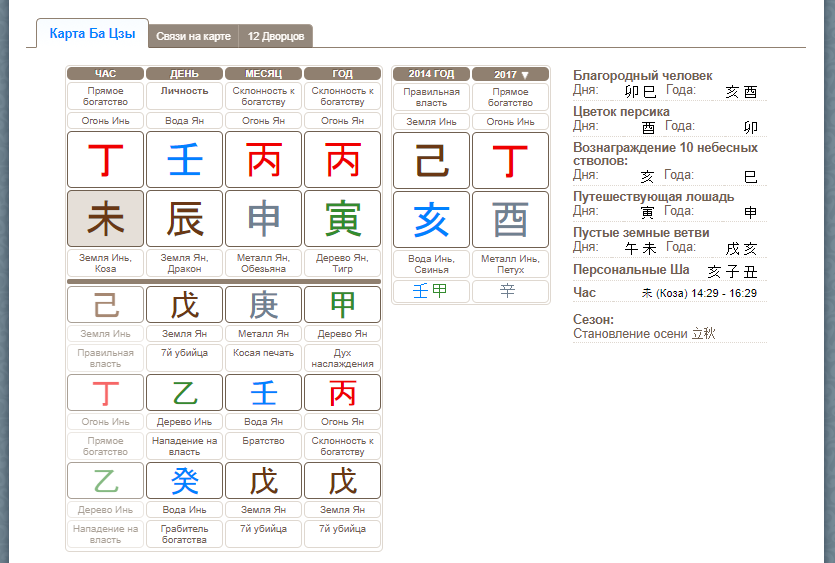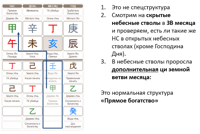 - Если же и их вы не нашли, то структура карты, характер и предпочтения человека не будут ярко проявлены. В этом случае мы будем считать богом, образующим структуру, основную ци, то есть первый скрытый небесный ствол в месяце.