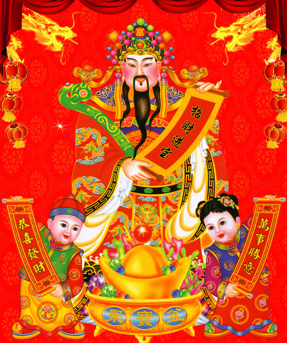 Классический ритуал начинается на улице, вне дома; "Портрет" Бога Богатства устанавливается перед угощением и ароматическими палочками. Пожелания пишутся заранее. Обычно Бога Богатства приветствуют еще на улице стоя лицом к нему, после медитации. Сжигают китайцы бумажные деньги (не настоящие, конечно) и изображение Бога Богатства прошлого года. Далее новое изображение Бога вносится в дом. Рекомендуют делать 3, 8, 13, 18, 23 или 28 шагов.