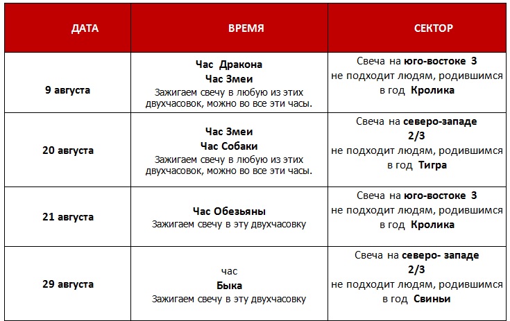 10, 22 августа -  все начатое в эти дни  множится. Можно подписывать соглашения и открывать бизнес, праздновать новоселье, собирать долги. Не подходит для свадьбы, подписания обременительных договоров, вступления в новую должность. Не стоит брать кредиты и начинать судебные дела. Не подходит для рожденных в год Дракона.