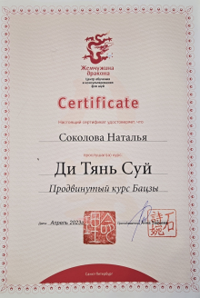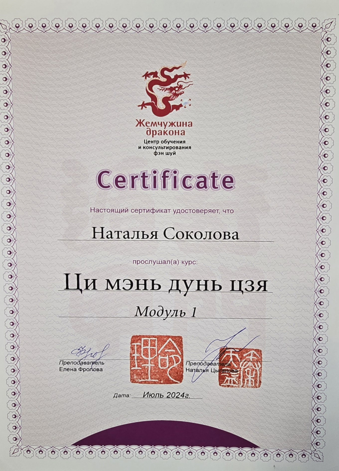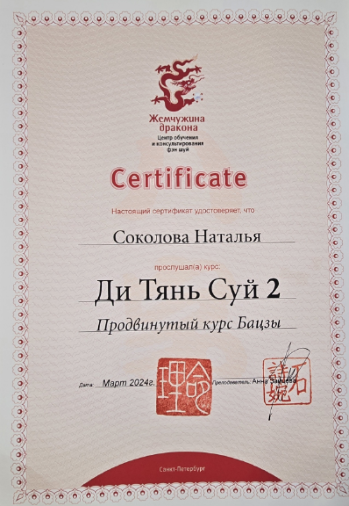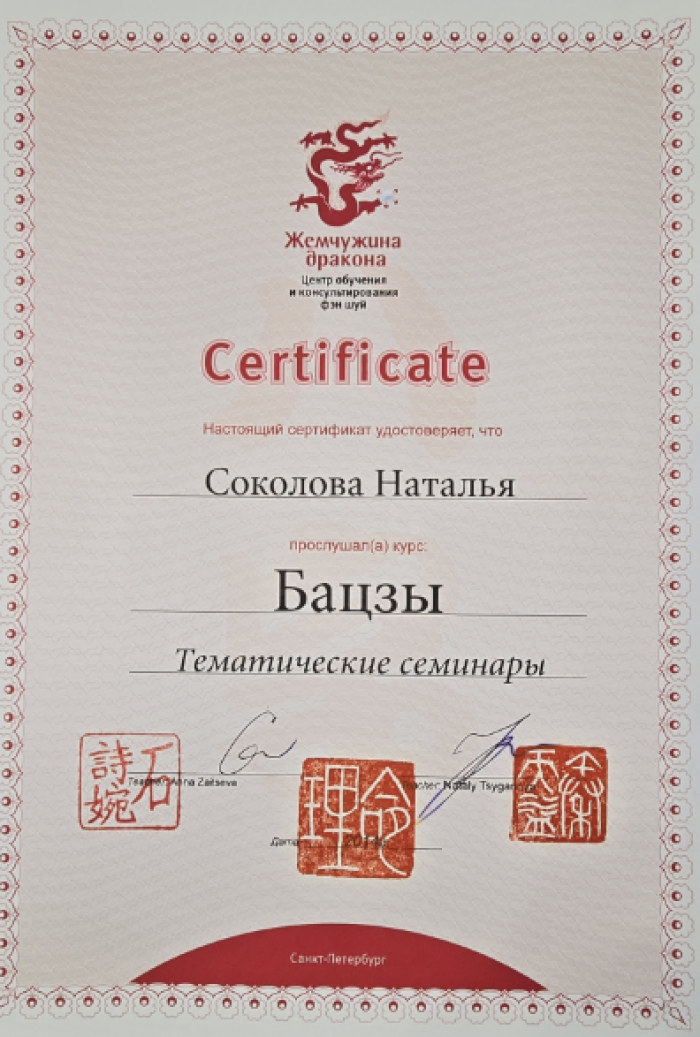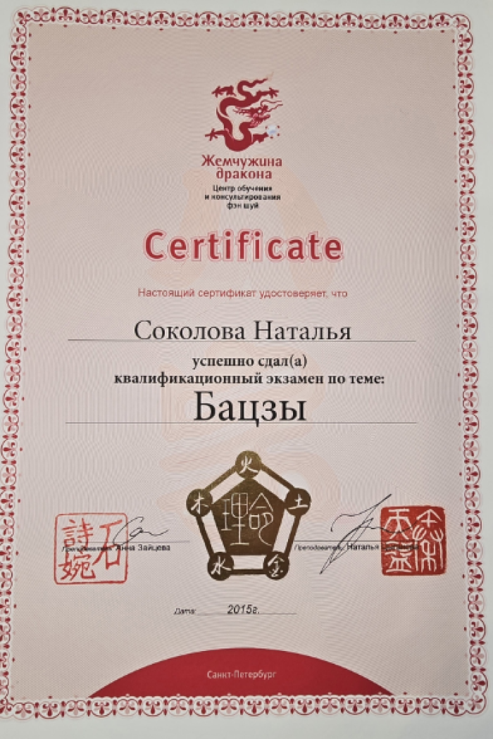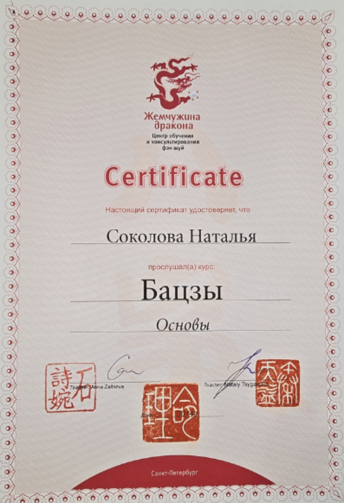 Я – сертифицированный консультант по бацзы от центра обучения и консультирования «Жемчужина Дракона». Также я являюсь сертифицированным инструктором по «Практикам Вселенского Дао».