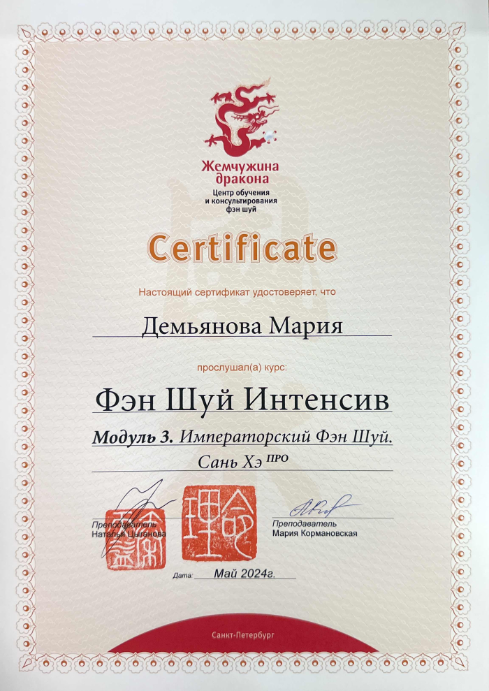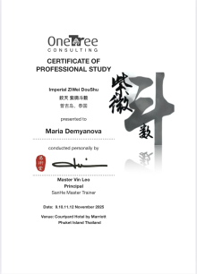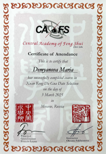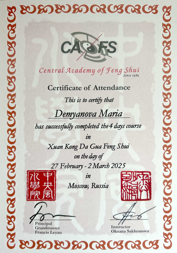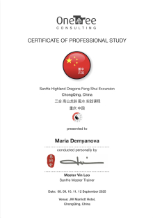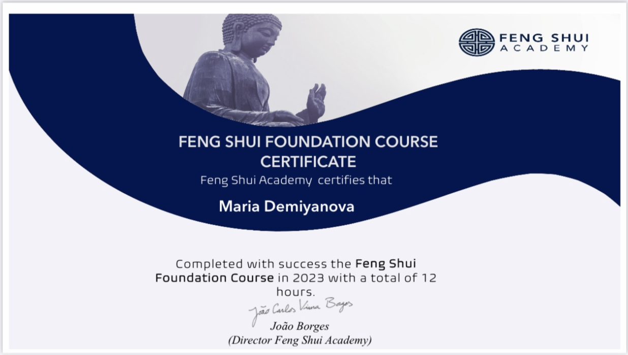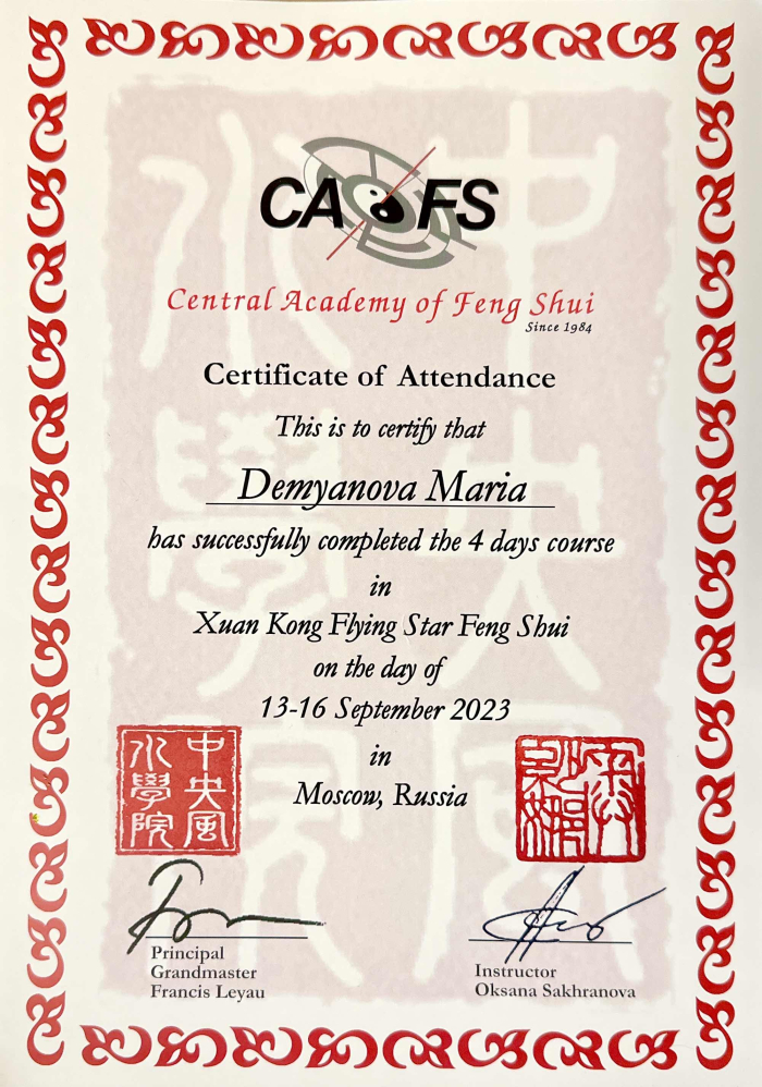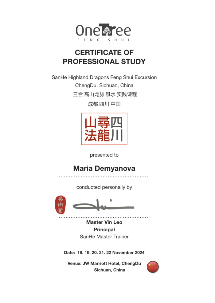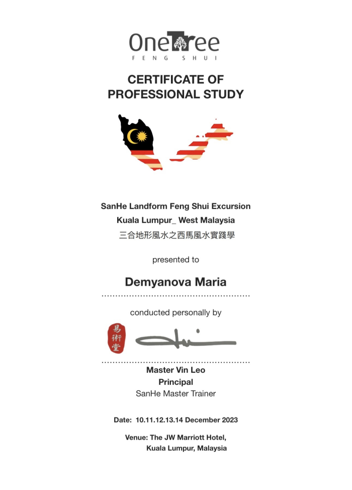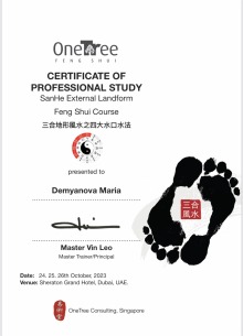 За последние годы я решила систематизировать свои разобщённые знания по фэн шуй и другим наукам китайской метафизики, за что безмерно благодарна школе Mingli, в которой я приобрела прочный фундамент по фэн шуй, бацзы, ци мэнь дунь цзя. Также мне посчастливилось пройти «золотой стандарт Сань Хэ», включающий императорский фэн шуй, внешний и внутренний Сань Хэ, у Мастера Вин Лео, а также пройти курс «Летящие звёзды Сань Юань» по лицензии Мастера Френсиса Леяу.