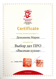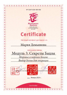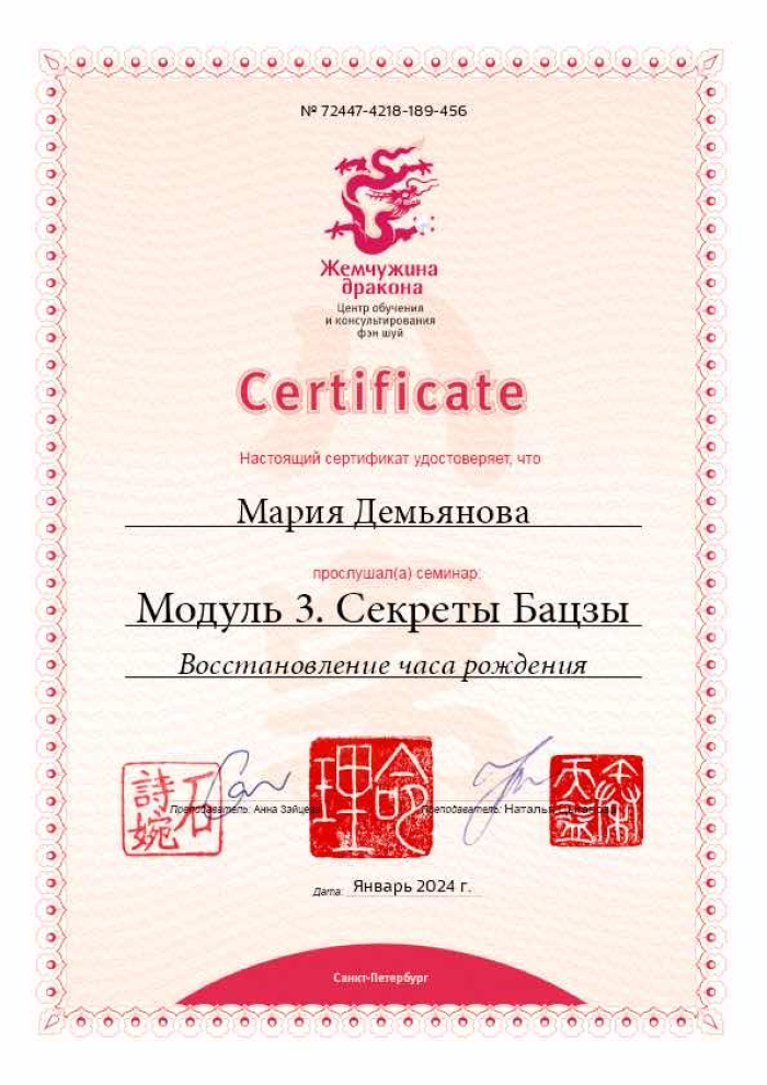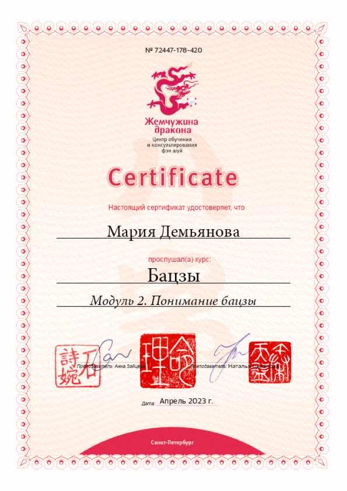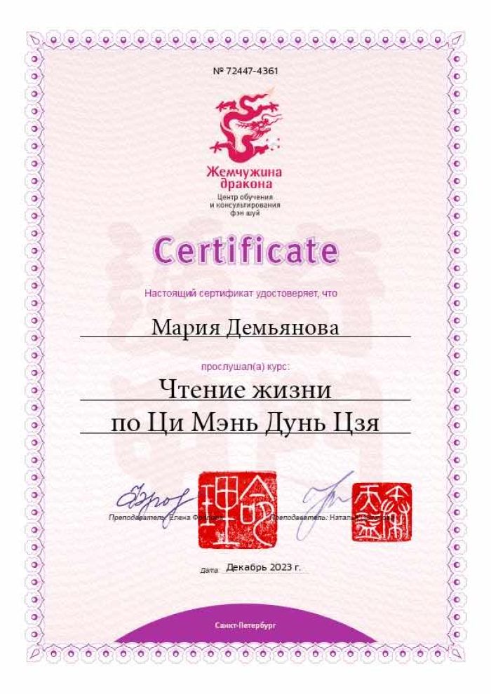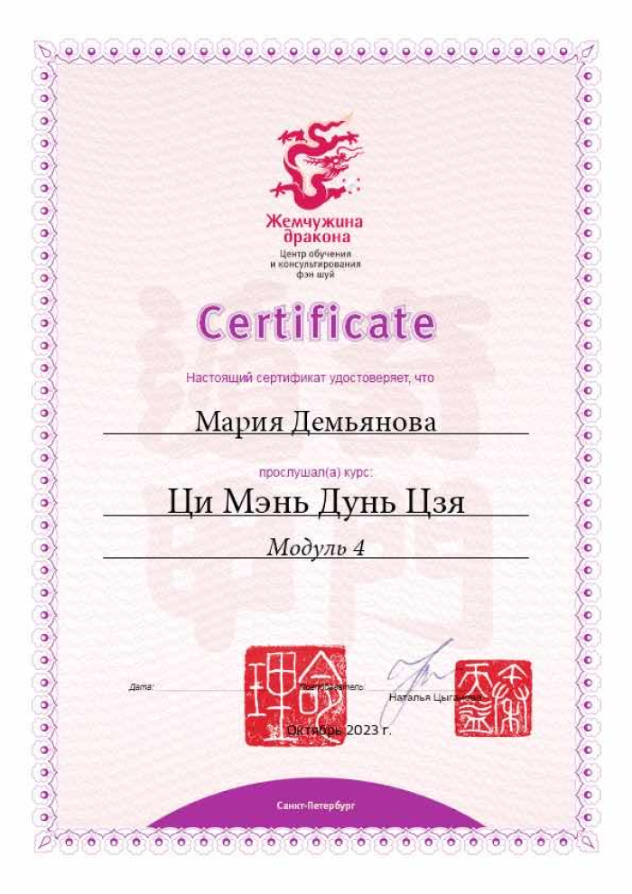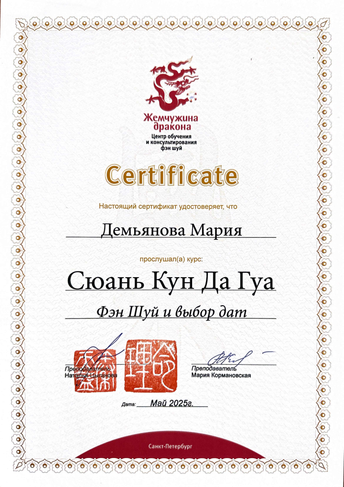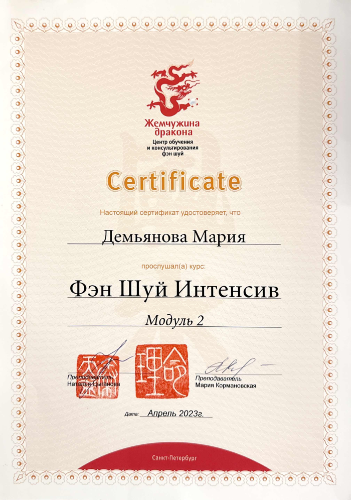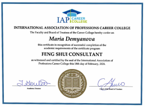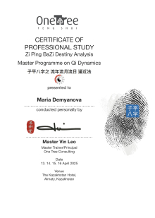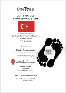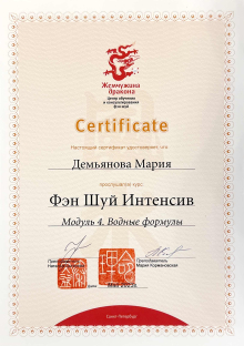 За последние годы я решила систематизировать свои разобщённые знания по фэн шуй и другим наукам китайской метафизики, за что безмерно благодарна школе Mingli, в которой я приобрела прочный фундамент по фэн шуй, бацзы, ци мэнь дунь цзя. Также мне посчастливилось пройти «золотой стандарт Сань Хэ», включающий императорский фэн шуй, внешний и внутренний Сань Хэ, у Мастера Вин Лео, а также пройти курс «Летящие звёзды Сань Юань» по лицензии Мастера Френсиса Леяу.
