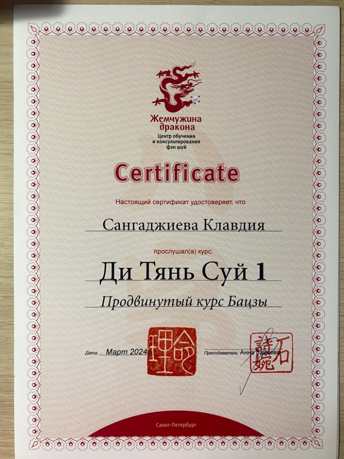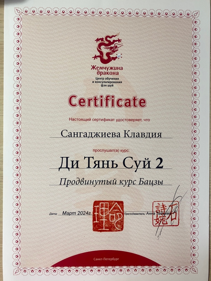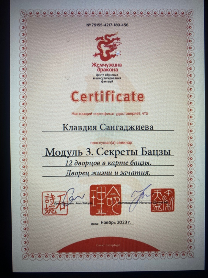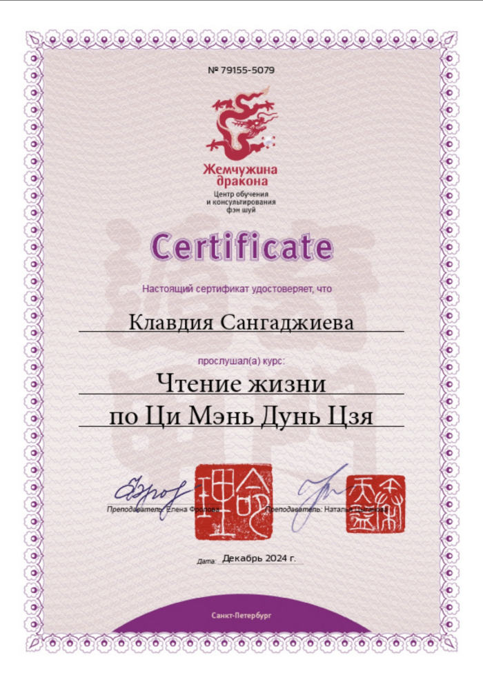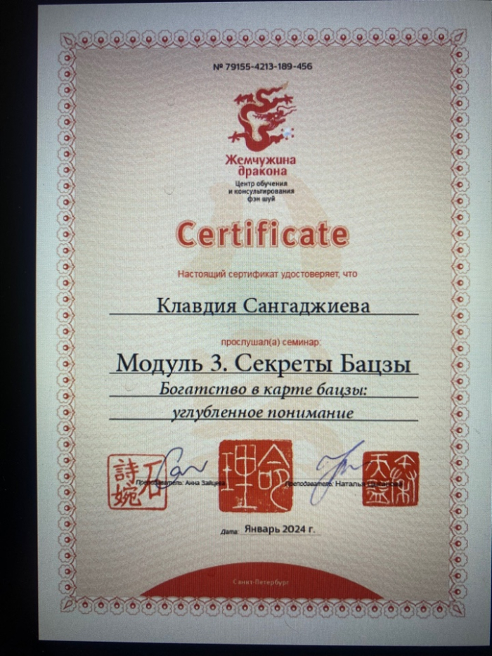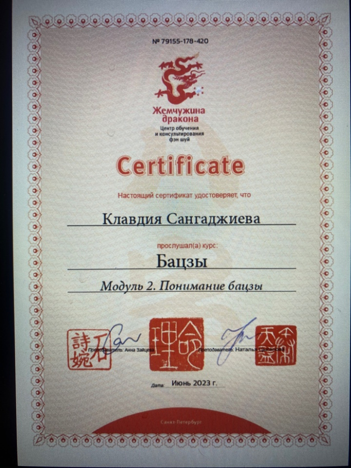Меня зовут Клавдия, я сертифицированный консультант по Бацзы от центра обучения и консультирования "Жемчужина Дракона". С января 2023 года прошла все обучающие курсы по Бацзы на Минли. С осени 2023 года успешно провожу консультации. От всей души благодарю за полученные знания преподавателей, Анну Зайцеву и Наталью Цыганову. На данный момент продолжаю обучение на курсе по фэн шуй на Минли.